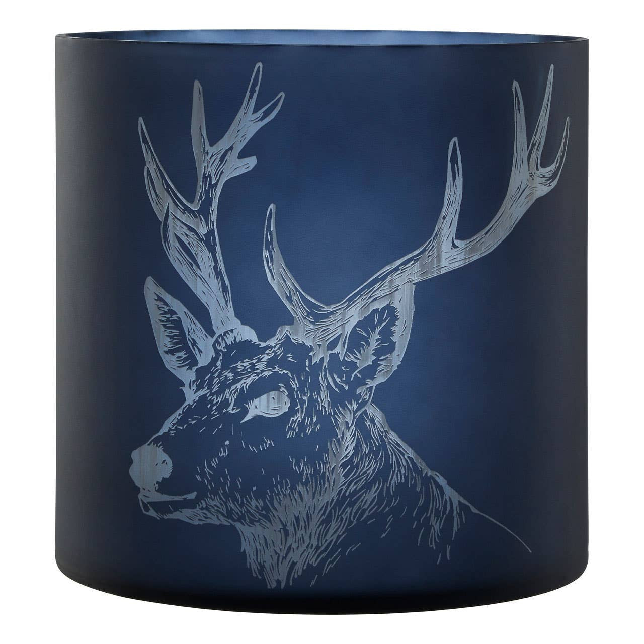 Etched into the blue glass of this hurricane candle holder is a detailed stag head motif, complete with shaded antlers. This handcrafted holder perfectly complements boho and contemporary abodes.